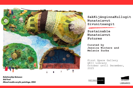 Currently on display in the First Space Gallery, Queen Elizabeth II Library, is Sustainable Nunatsiavut Futures (SNF) curated by Jessica Winters and Melanie Zurba. The exhibit will be on display until December, 2025. Artists include: Belinda Shiwak, Katelyn Jacque, Emelia Angnatok, and Sid Ford.